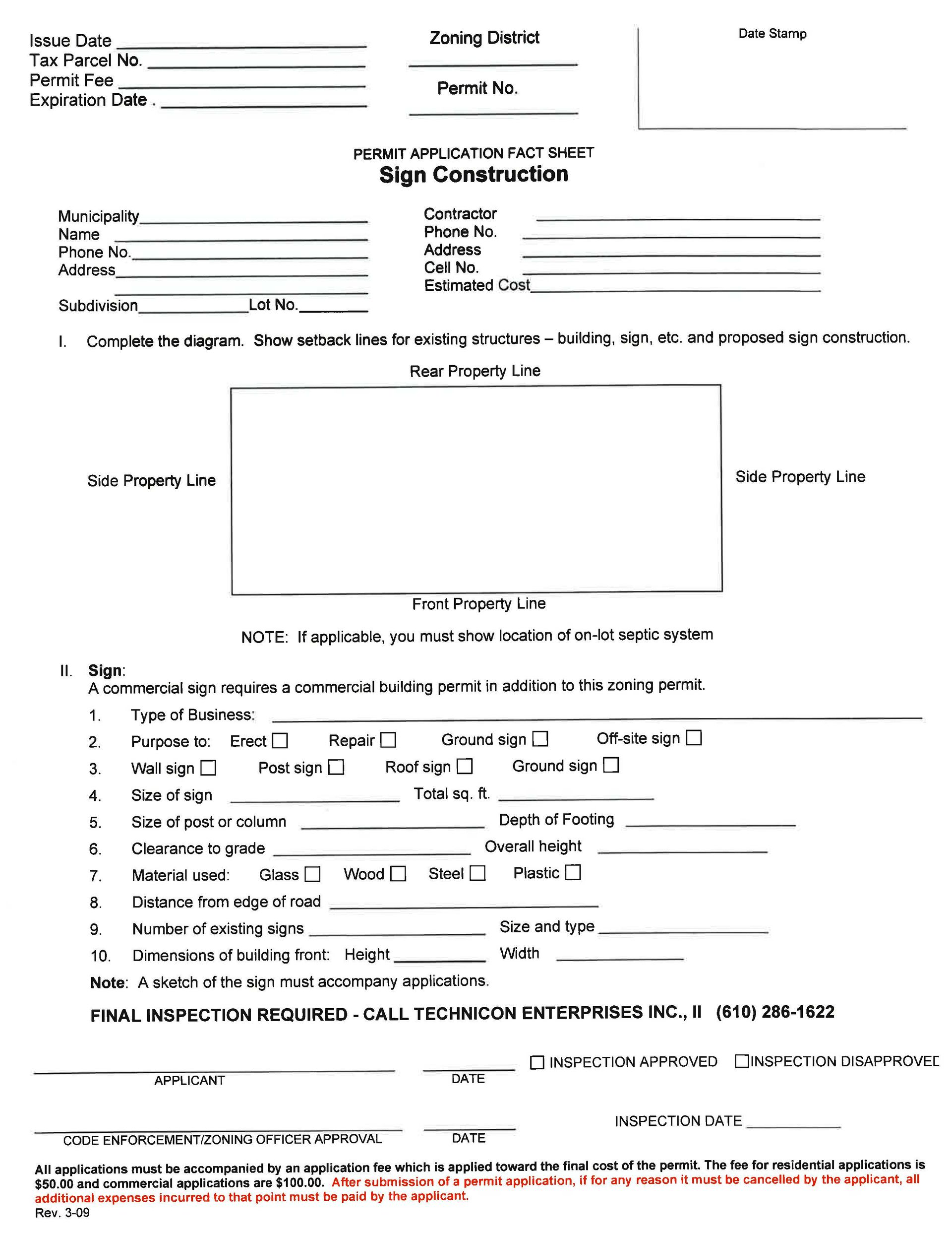 All applications must be accompanied by an application fee which is applied toward the final cost of the permit. The fee for residential applications is $50.00 and commercial applications are $100.00.